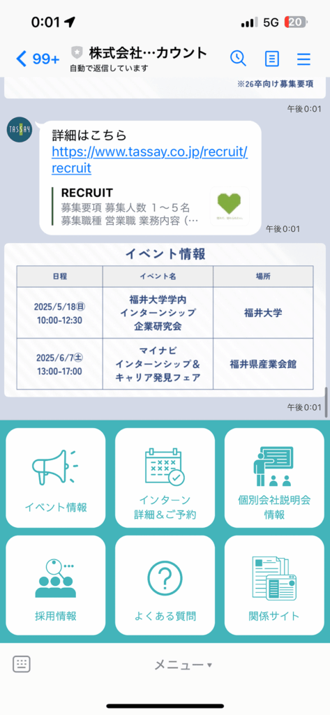 LINEでは「ステップ配信」が可能。登録直後に企業紹介、2日後に社員インタビュー動画、3日後に説明会案内…といった情報を自動で届けられます。
